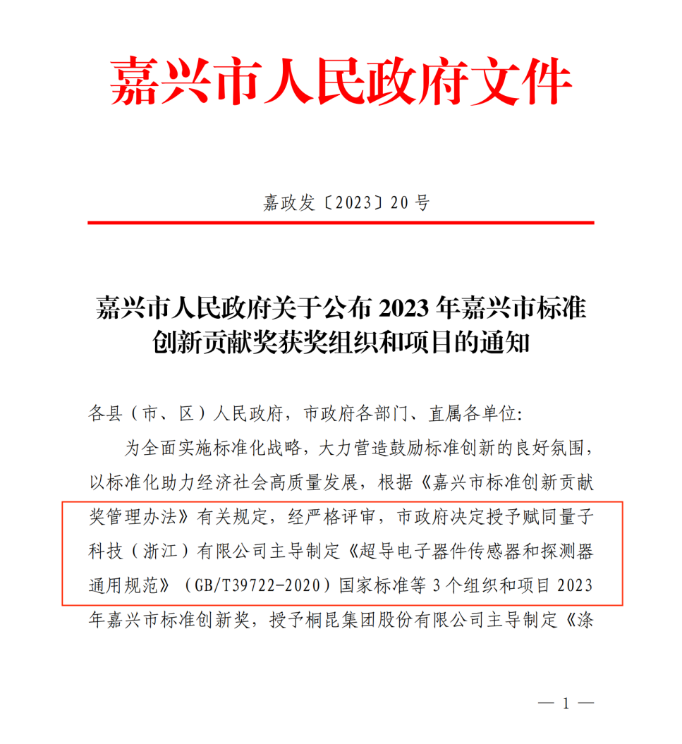 日前,2023年嘉興市標(biāo)準(zhǔn)創(chuàng)新貢獻(xiàn)獎表彰名單公布。賦同量子主導(dǎo)制定的國家標(biāo)準(zhǔn)《超導(dǎo)電子器件傳感器和探測器通用規(guī)范》(GB/T39722-2020)榮獲“2023年嘉興市標(biāo)準(zhǔn)創(chuàng)新貢獻(xiàn)獎”。