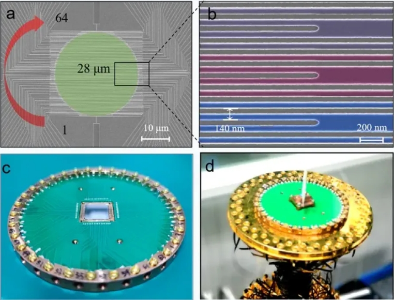 (a)器件結(jié)構(gòu),(b)超導(dǎo)納米線,(c)器件封裝,(d)制冷系統(tǒng)