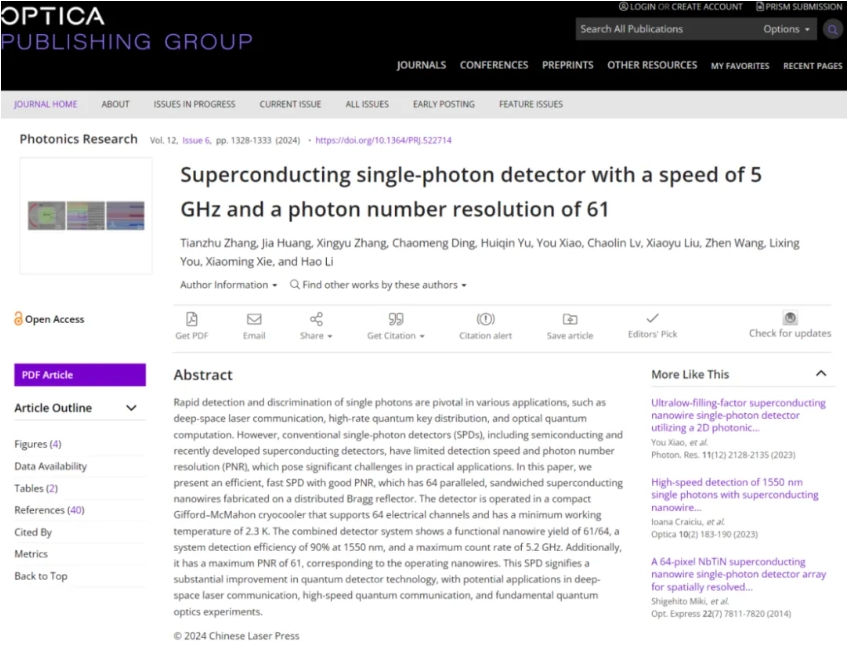 近日,中國科學(xué)院上海微系統(tǒng)所李浩、尤立星團隊,利用三明治結(jié)構(gòu)超導(dǎo)納米線、多線并行工作的方式實現(xiàn)最大計數(shù)率5GHz、光子數(shù)分辨率61的超高速、光子數(shù)可分辨光量子探測器,相關(guān)成果以“Superconducting single photon detector with speed of 5 GHz and photon number resolution of 61”為題于2024年5月31日在線發(fā)表在中國科學(xué)院一區(qū)學(xué)術(shù)期刊《光子學(xué)研究》(Photonics Research)上,并入選編輯推薦(Editor's Pick)。