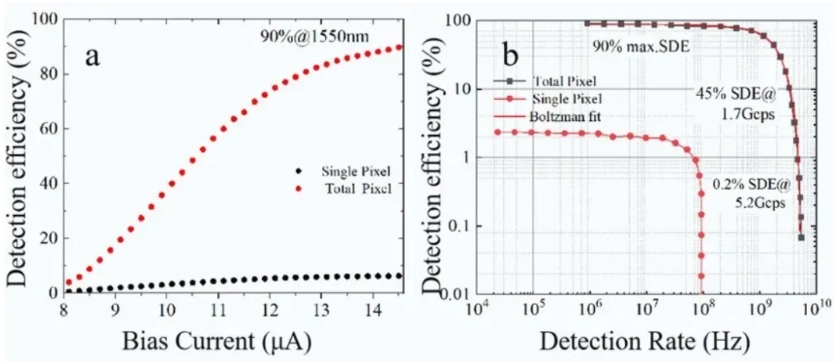 (a)器件探測效率隨偏置電流的變化關(guān)系,(b)探測效率隨探測速率的變化關(guān)系