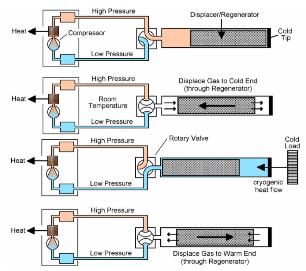 G-M制冷機的制冷過程是“氦氣的壓縮-膨脹循環(huán)”,分為四個關鍵階段,恰似一次完整的“呼吸”: